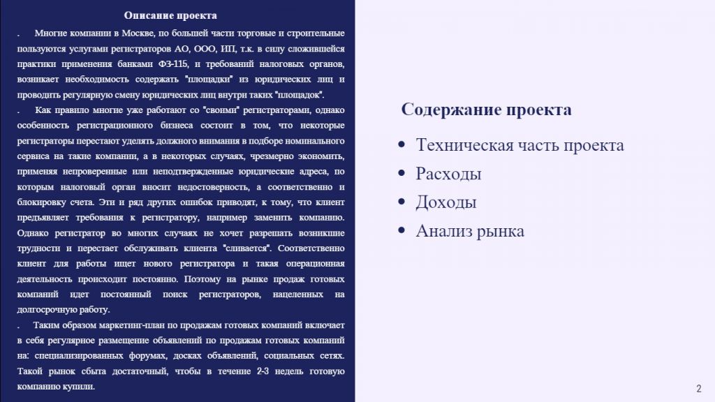 Меня зовут Александр Шестаков. Я являюсь основателем компании - регистратора бизнеса и предлагаю вам принять финансовое участие в подготовке юридических лиц с нанятыми директорами и открытыми расчетными счетами для последующей продажи таких компаний. Ваше участие предлагается в форме проектного финансирования с еженедельными выплатами начиная с шестой недели вашего участия в проекте