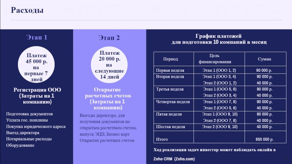 Этап 1 Регистрация ООО (Затраты на 1 компанию): Платеж 45 000 р. на первые 7 дней