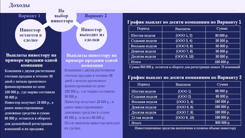 Инвестор получает 15 000 р., а ранее инвестированные денежные средства в сумме 65 000 р. остаются в обороте для дальнейшей регистрации компаний и их продажи и выплат инвестору. По объему сделки равной 10-ти компаниям еженедельная выплата составит 30 000 р., а ранее финансированная сумма в 650 000 р. будет работать дальше.