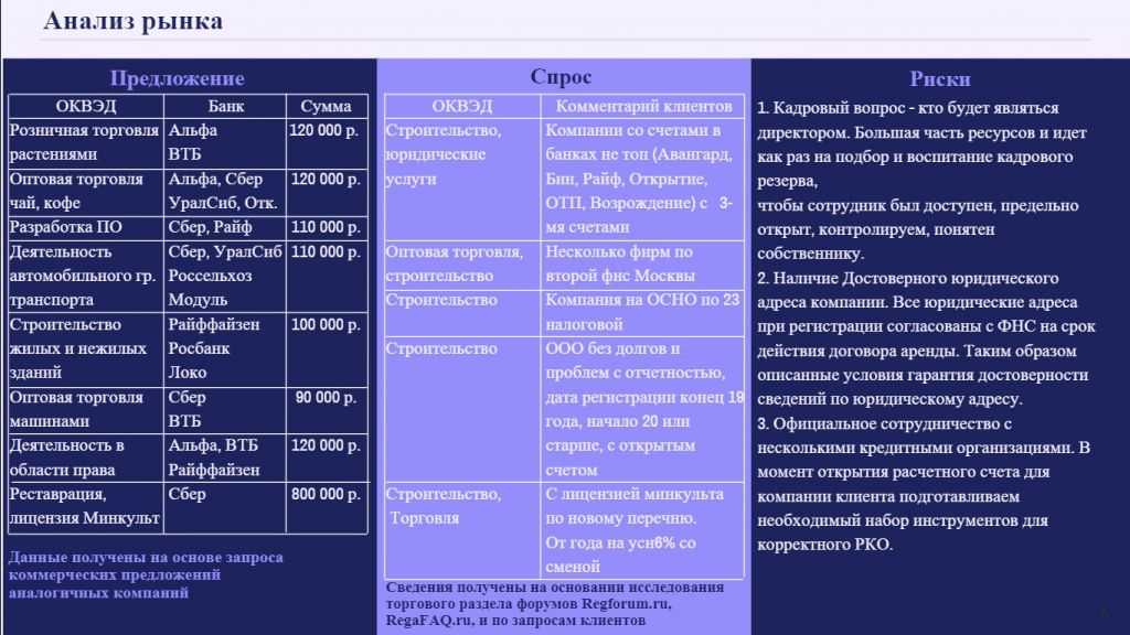 3. Официальное сотрудничество с несколькими кредитными организациями. В момент открытия расчетного счета для компании клиента подготавливаем необходимый набор инструментов для корректного РКО.