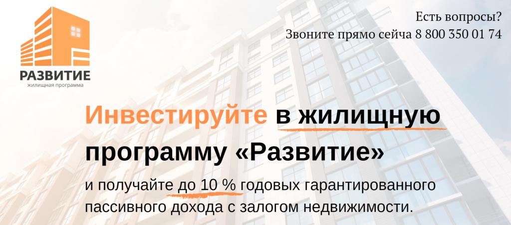 Инвестируйте в жилищную программу «Развитие» и получайте до 10% годовых пассивного дохода под залог недвижимости по всей стране.