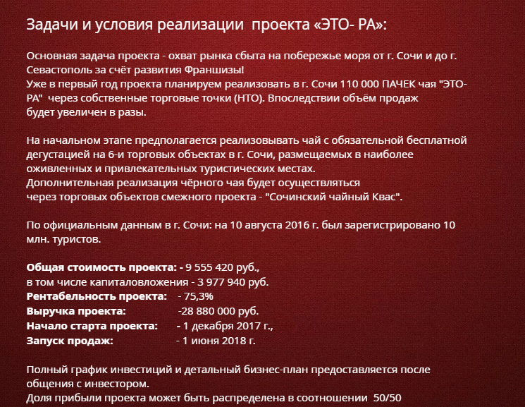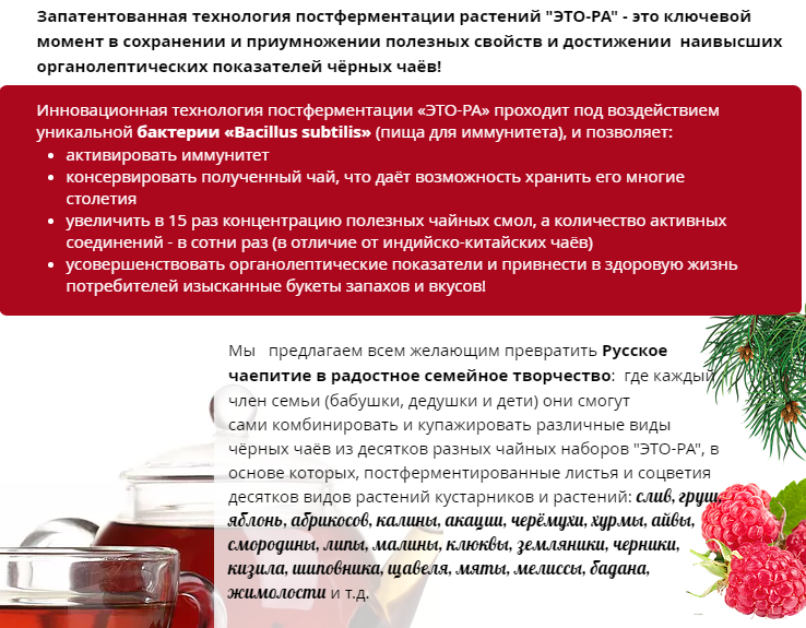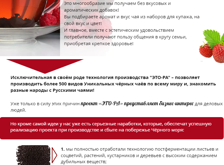От производства 500 видов чёрных чаёв - "ЭТО-РА" и, до реализации упакованного чая в собственной сети сбыта г. Сочи!