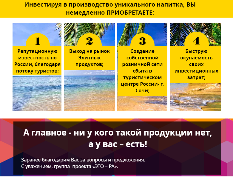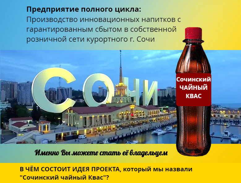 Производство инновационных напитков с гарантированным сбытом в собственной розничной сети курортного г. Сочи
